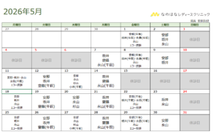 5月の担当医・休診日 2026.04.21 誠に勝手ながら5月15日(金)ならびに16日(土)は休診とさせていただきます。ご迷惑をおかけしますが、何卒よろしくお願いいたします。 Tweet Share RSS Pin it この記事のタイトルとURLをコピーする 4月の担当医・休診日 前の記事